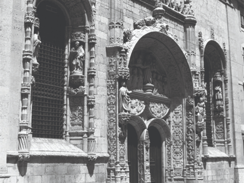 Igreja de Nossa Senhora da Conceição Velha. Igreja da Conceição Velha, local da primitiva igreja da Misericórdia – antiga Porta lateral. Pormenor: Nossa Senhora da Misericórdia, D. Manuel I, D. Leonor e Papa Leão X.